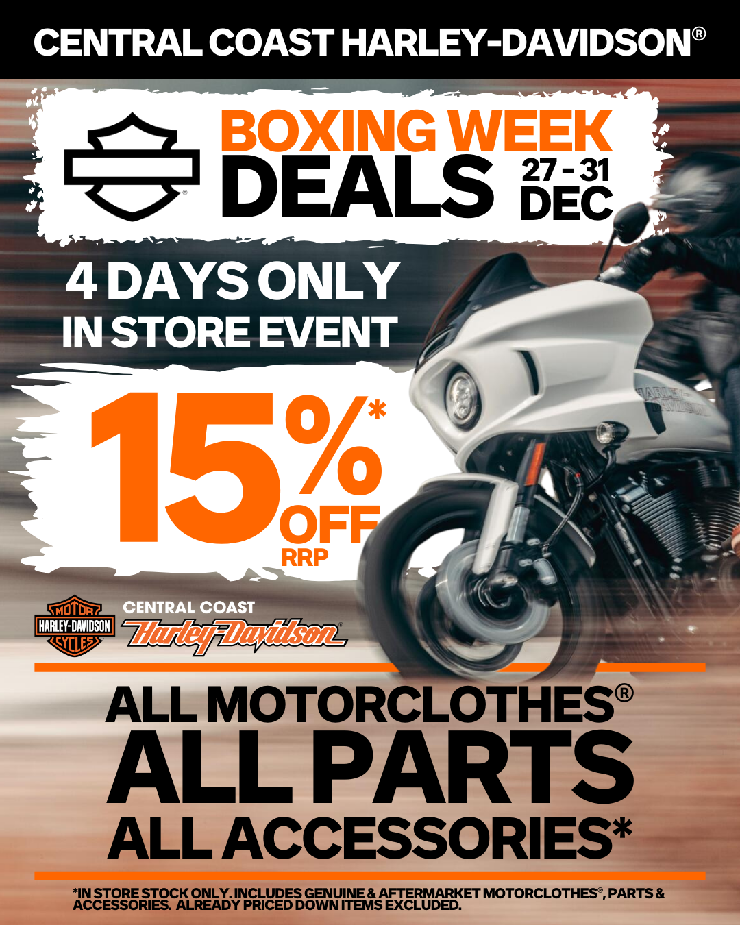 Get 15% Off ALL In Stock Motorclothes®, ALL Genuine Harley-Davidson® Parts & ALL Accessories At Central Coast H-D®.*