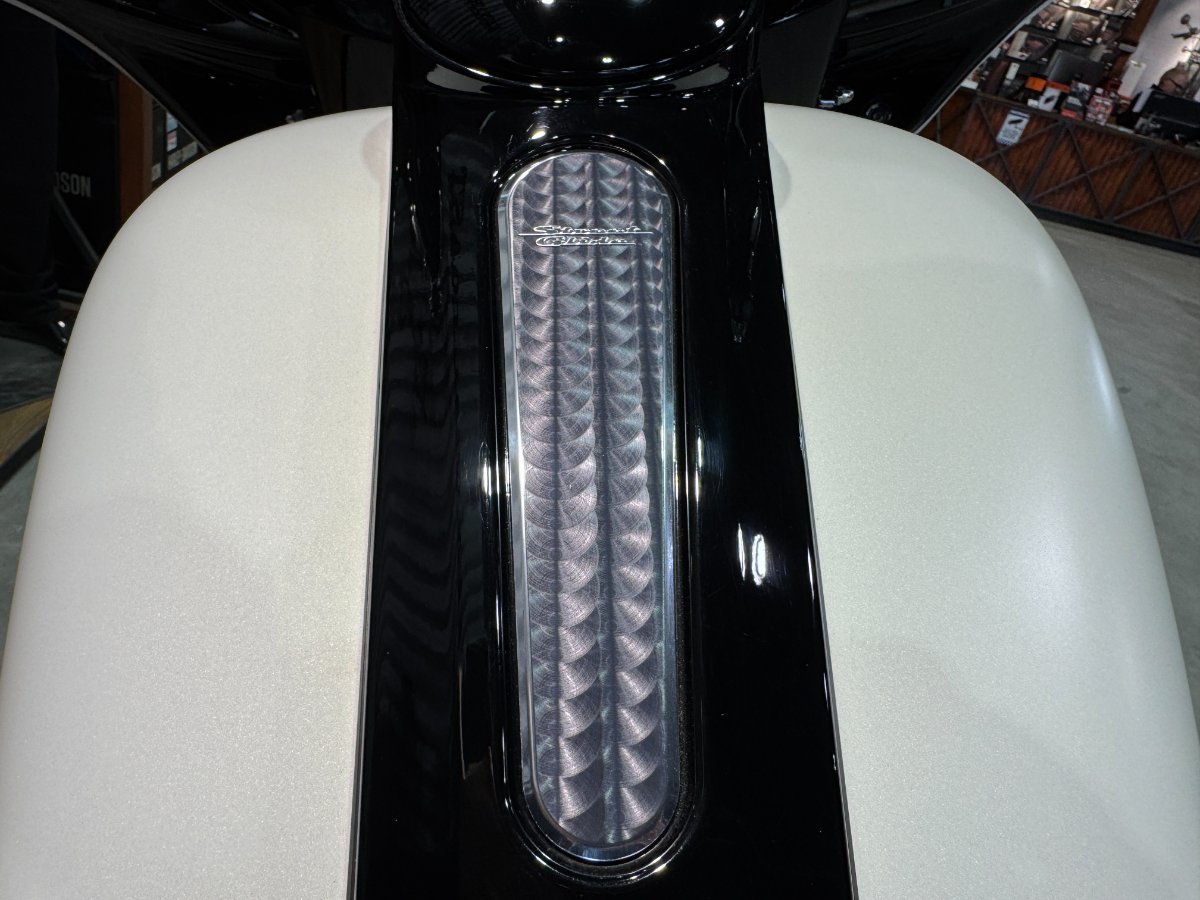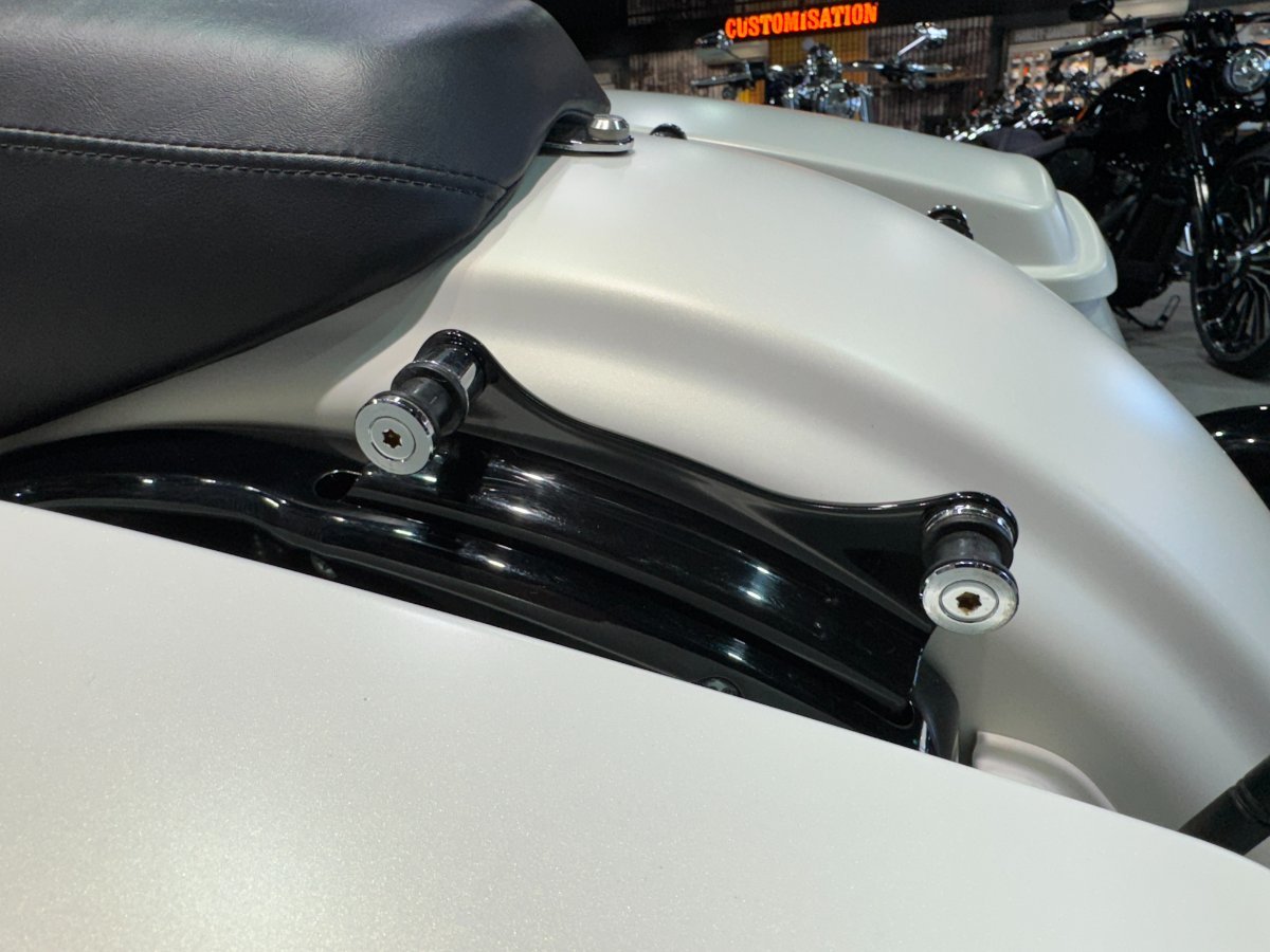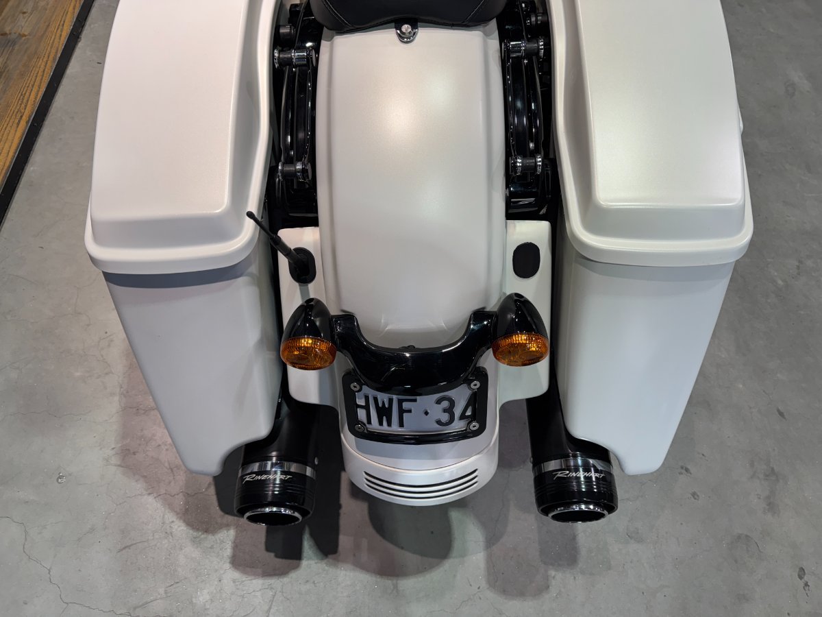 Stage 4 WOW what a bike! Amazing white denim paint, upgrades include Rhinehart exhaust system, docking hardware, upgraded pegs and grips, pannier crash bars, chin spoiler, and axle covers.